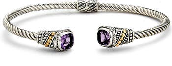 A braided texture and intricately carved filigree defines this cuff bracelet complete with semiprecious stone endcaps that shimmer and shine on your wrist.