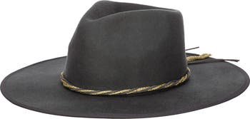 A timeless silhouette defines a hat shaped from brushed wool detailed with a chain trim and furnished with a wide, shady brim for a practical finish.