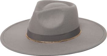 Faux-felt fabrication distinguishes a signature fedora hat made with a wide brim framed by a grosgrain ribbon and delicate, polished chain.