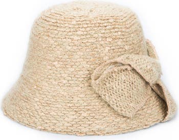 An intricately folded detail adds eye-catching style to this knit cloche hat.