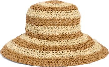 Shield your face from the sun by topping your look with this crochet hat made with neutral stripes for easy pairing.