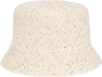 Get cozy in this soft bucket hat featuring a cable-knit pattern in flecked, cream-hued yarn.