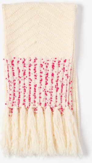 Stay warm on chilly days with this knit scarf fashioned with a pop of neon color and tassels at the end.
