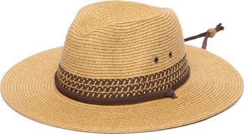 A wide brim lends soft shade to a woven hat with a dimpled, fedora-style crown and built for adventure with a secure drawcord chin strap.