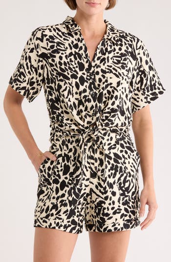 Breeze through your weekend in this lightweight short-sleeve button-up shirt fashioned with a tie hem for '90s-inspired style.