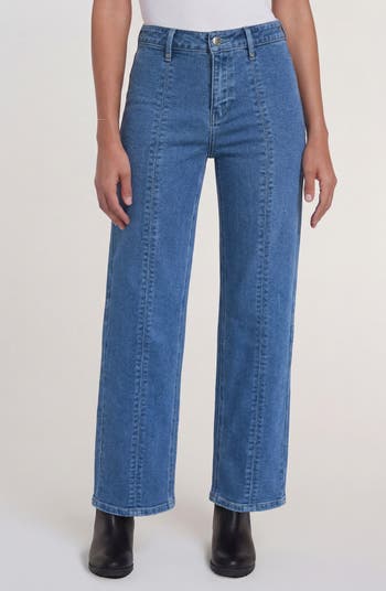 Keep it timeless with these mid-rise jeans styled with center seams, designed with full‑length straight legs, a low‑stretch fit, and a lived‑in wash.