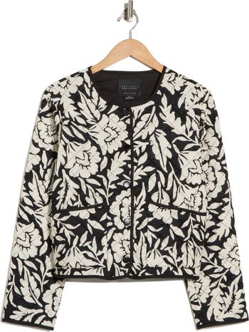 Bring instant flair to your look with this lightweight quilted jacket fashioned with a bold floral print and handy patch pockets.