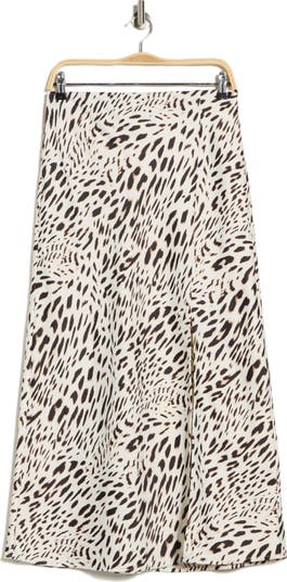 Chic animal spots pattern this rich, satiny skirt, finished with a soaring front slit ideal for weekend outings.
