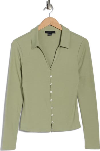 Perfect for the workday or weekend, this long-sleeve button-up top is cut from a soft ribbed knit in a fitted silhouette.