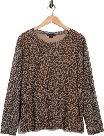 Stretchy mesh creates a figure-hugging fit in this long-sleeved top covered with a bold print.
