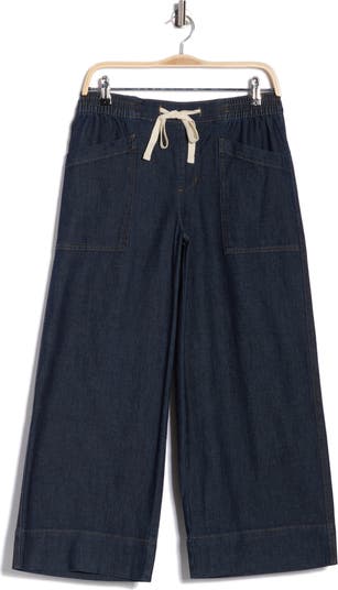 An elastic-drawstring waist boosts the comfort level of these cropped wide-leg jeans finished with roomy pockets for utility-inspired style.