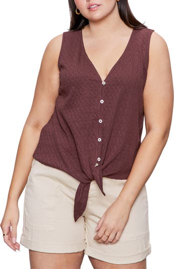 A textured cotton-blend fabric with a touch of stretch brings sunny-weather style to this button-up tank detailed with a jaunty tie at the front hem.