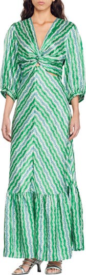 A captivating print and subtle bodice cutouts lend visual intrigue to an ankle-grazing maxi dress finished with a flounced hem.