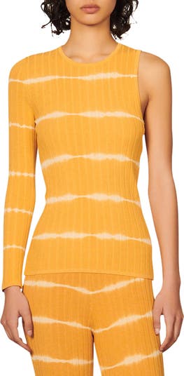 Wide ribbing and tie-dye stripes pattern this asymmetric top featuring a long sleeve on one side and no sleeve on the other.