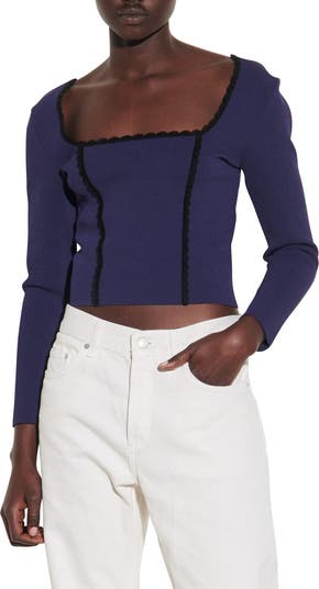 Braided trim traces the square neckline and frames the front à la princess seams on this cropped pullover that's perfect for pairing with high-rise bottoms.