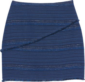 Fringed trim lends depth and dimension to a miniskirt patterned in subtle stripes highlighted by metallic details to illuminate your look.