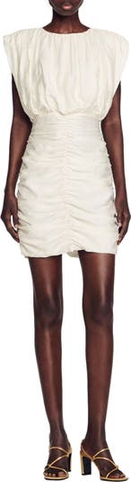 This lovely linen-kissed dress is designed with strong shoulders and a lusciously ruched skirt.