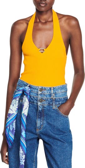 Ribbed, stretchy fabric keeps you comfortable in a summery top boasting a deep halter neckline highlighted by a metal bit for eye-catching appeal.