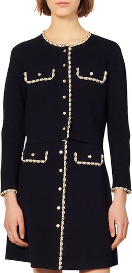Lacy trim and burnished buttons polish this office-ready jacket.