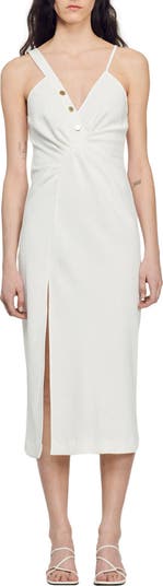 A trio of polished buttons shine brightly along the crossover neckline of a figure-skimming dress cut with a front slit to ease every movement at cocktail hour and beyond.