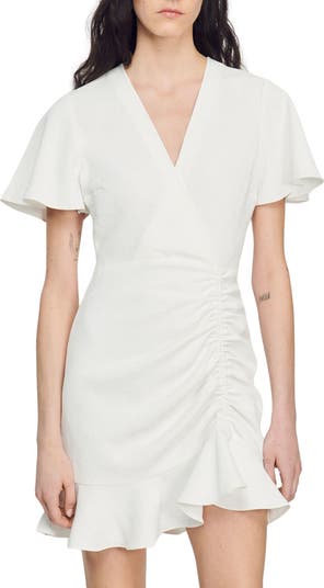 A ruched accent helps shape the silhouette of this faux-wrap midi dress framed by frilly sleeves and a matching hem.