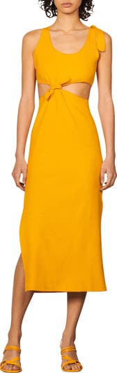Flirty cutouts are tied together by an oversized knot at the waist of a side-slit midi dress crafted in a citrusy hue.