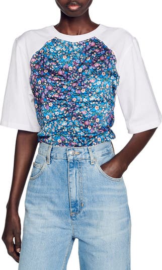Center ruching and a garden of flowers define the bodice of this pure-cotton T-shirt framed with sporty raglan sleeves.