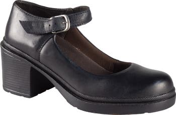 A wrapped block heel lends modern lift to this amply cushioned leather pump topped with a dainty mary jane strap.
