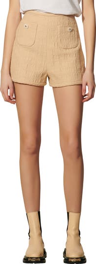 Achieve a modern desk-to-dinner vibe in these versatile high-waist shorts fashioned from a textured cotton blend and finished with bedazzled floral buttons.