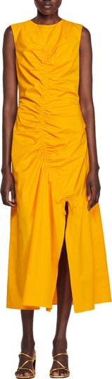 Modern cinching lends distinctive detail to a bold midi dress that brings sunshine vibes wherever you go.