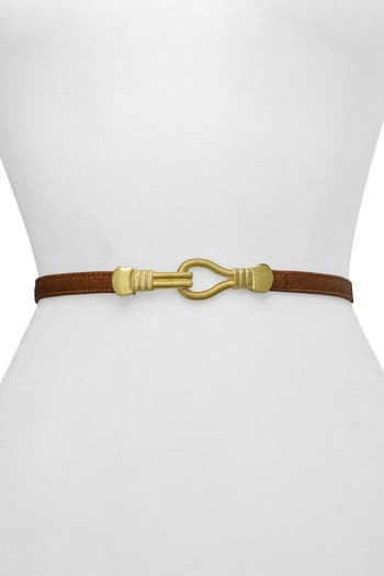 A hook belt with a textured buckle adds contrast to this sleek leather belt that makes the perfect finishing touch to any outfit.