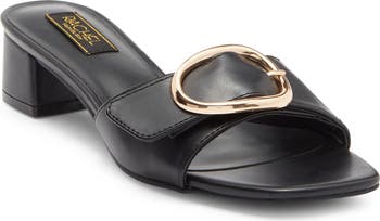A decorative buckle brings a polished touch to this smooth faux-leather slide sandal lifted by a modest block heel.