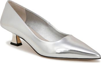 A pointy toe and flared kitten heel frame a contemporary pump set on a well-cushioned footbed for lasting comfort.