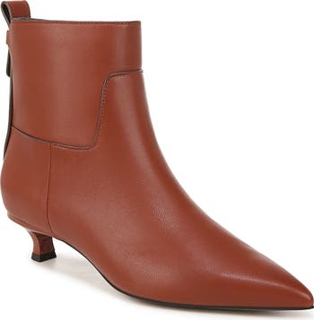 A pointy toe and kitten heel balance a luxe bootie fitted with a rear pull-tab and side zipper for easy entry.