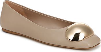 Metallic hardware gleams atop a square-toe flat that offers supportive, ergonomic comfort.
