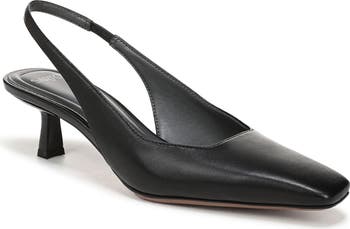 A snip toe and elasticized slingback strap create a streamlined profile on a rich leather pump set on a flared kitten heel for a hint of height.