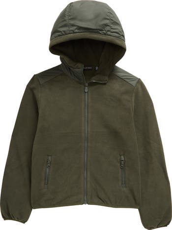 Soft, water-resistant fleece keeps your kid warm and dry in a hoodie that's made of recycled fibers and sized for easy layering in the cold.