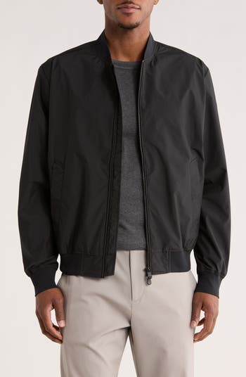 A relaxed fit makes layering easy with this wind- and water-resistant bomber jacket featuring a sporty two-way zip closure and soft ribbed trim.