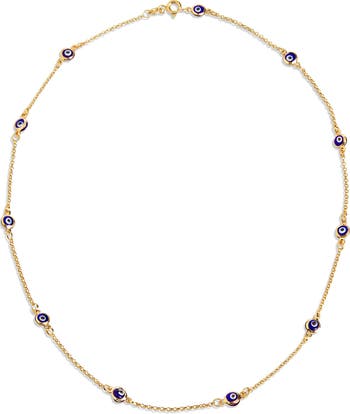 Finish your look with a necklace featuring evil eye details for chic styling.