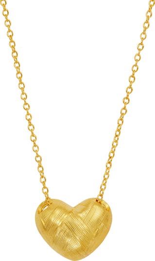 This pendant necklace features a wide heart pendant with a textured basket‑weave design for a bold yet romantic finish.