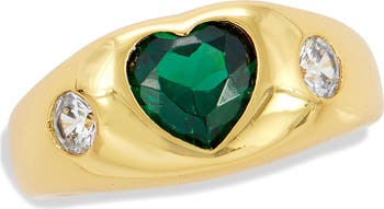 A heart-shaped stone is flanked by smaller round-cut cubic zirconia that top this domed ring plated in 18-karat gold.