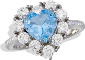 Polished rhodium plating frames this statement ring showcasing a vibrant heart-cut center CZ encircled by a halo of sparkling CZ accents.