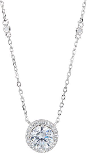 A sparkly halo frames a brilliant-cut cubic zirconia pendant on this dazzling necklace crafted from sterling silver and plated in polished rhodium.