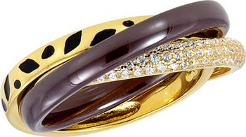 An intricate crossover design combines three bands into one on this polished ring finished in 18-karat gold plating and highlighted by cubic zirconia.