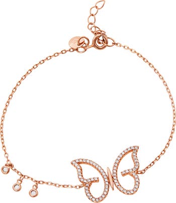 Cubic zirconia defines the trio of shakers and butterfly charm on a delicate chain bracelet done in a rosy high-shine finish.