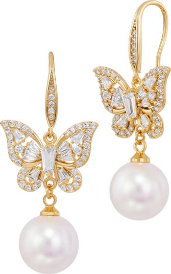 Cubic Zirconia & Faux Pearl Drop Butterfly Earrings