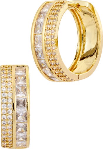 Square- and round-cut cubic-zirconia stones make a shimmering statement against these polished hoops done in warm 18-karat-gold plating.
