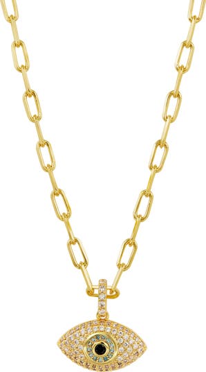 Protect your energy and elevate your look with this paperclip-chain necklace anchored by a evil-eye pandant with sparkling cubic-zirconia pavé.