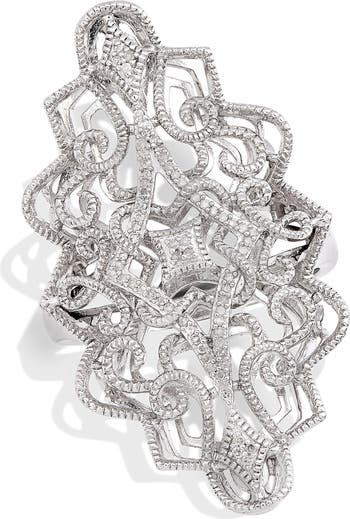 An elegant rhodium plated sterling silver ring features cutout filigree with pavé white diamonds for dazzling sparkle.
