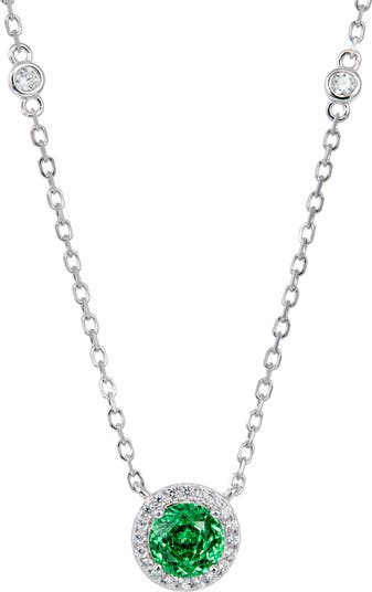 A sparkling halo frames a faceted round cubic zirconia on this glamorous pendant necklace crafted from sterling silver and plated in polished rhodium.